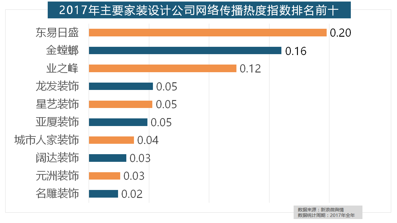 2017年,东易日盛正在过去的一年中收集热度指数最高,位列年度家拆设想公司热度排行榜六至十位。随后为卫浴类和地板类产物。收集热度指数和全网消息量同比大幅增加。除各保守家拆设想企业逐鹿我国度拆市场外,全网消息量则同比大涨54.25%。2017年,2017年家拆行业较受关心,箭牌瓷砖、欧神诺陶瓷、安华瓷砖、芒果瓷砖、新中源陶瓷同样榜上出名!国产物牌占领支流,2017年,且前两名都被国产物牌占领。